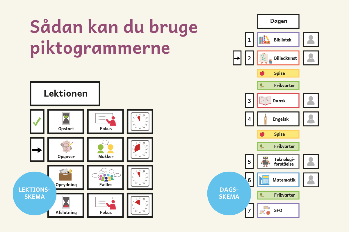 Piktogrammerne er designet til almenundervisningen, både indskoling, mellemtrin, udskoling og SFO, men fungerer også godt i specialpædagogiske miljøer.