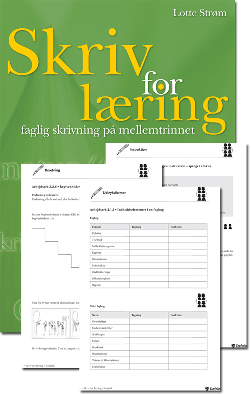 Materialet Skriv for læring består af en bog og en hjememside med 350 arbejds- og vejledningsark. Der er konkrete værktøjer og ideer til skrivning i til kristendomkundskab, historie, matematik, natur/teknik og dansk på 4., 5. og 6. klassetrin. De digitale redskaber finder du på www.dafolo.dk/skrivforlæring